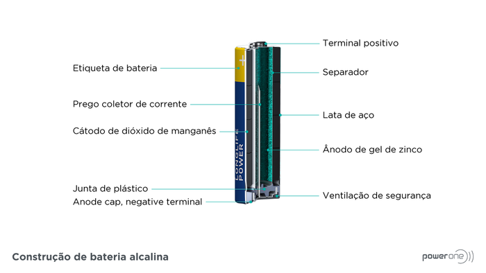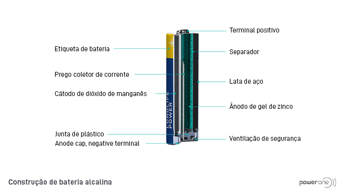 Um recetáculo de aço constitui a estrutura da pilha, que contém os elétrodos, um ânodo (o terminal negativo) e um cátodo (o terminal positivo). O cátodo é composto por anéis mate prateados feitos de dióxido de manganês, grafite e eletrólito. O ânodo é a pasta de zinco localizada dentro do separador. O separador mantém os eletrólitos separados para evitar um curto-circuito.
